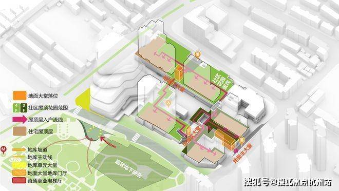 步行体验 为每个人规划不同动线 ; 中興傲舍项目,基于人的关系的角度去设计动线,在高混的业态中,为住宅用户创造私密性和独立性,如到达高线公园这一层都有门禁,只有住户能够抵达,从而将简单的道路线条演变为丰富的空间内容:出与入的记忆、城市与社区的联系、公区与私域的桥梁。
