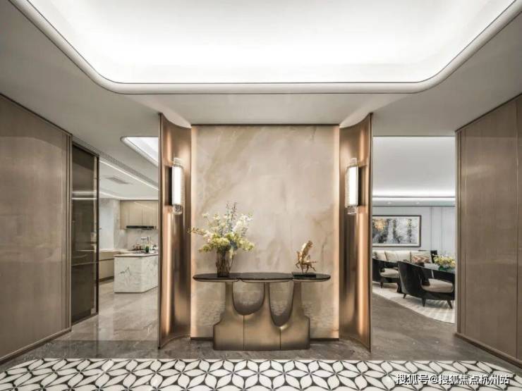 「玉兰门庭」摩登飘逸,环抱式落客前场,大师定制非遗掐丝珐琅门钹,流转温润光华,敬呈归家尊崇礼序,自此启幕生活的华贵序章。