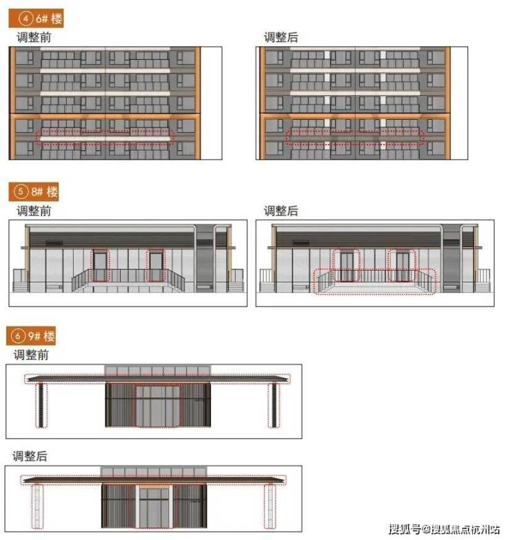 配套建筑同步升级:6#楼的南立面调整了铝线条间的涂料颜色;8#配电站将台阶玻璃栏杆换为更耐久的不锈钢栏杆,台阶及台阶下方浅色铝板改为浅色仿石涂料,并调整外门开启角度至180度,兼顾美观与实用;9#门卫兼快递收发室优化了屋面、柱子材质颜色,并根据现场深化了落地窗尺寸。