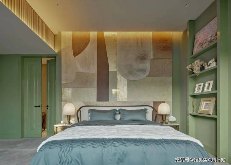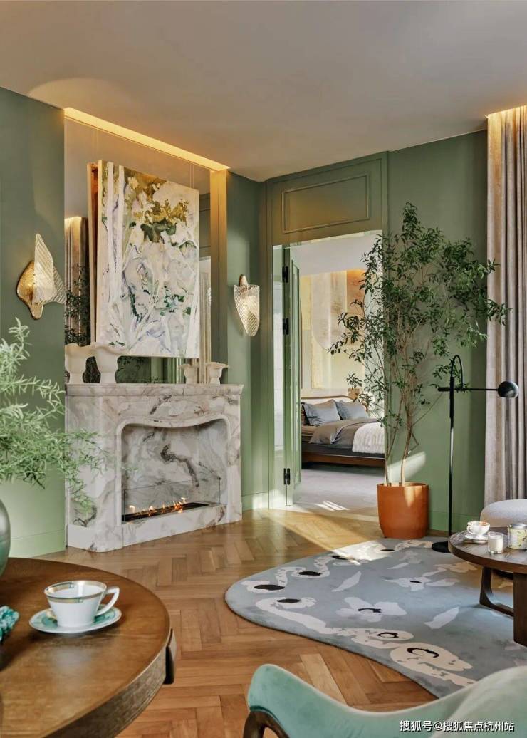 顶层下午茶区以淡绿为底,壁炉暖光漫过手绘地毯的肌理,将社交场域沉淀为冥想容器;主人房墙面缟玛瑙(Onyx)的天然流痕,也与一层屏风暗纹形成时空对位,光影在矿物晶体中生长出私密的诗。