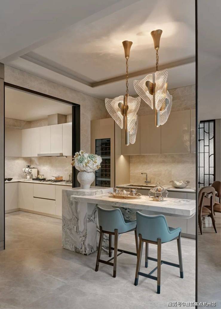 主厅核心区悬浮式定制柜体,银箔与丝绸在几何切割中构建中式基因,毕加索石材的天然裂变肌理成为天然艺术装置。瀑布吊灯以流体力学演绎东方留白,让光影在岩板表面生长出动态水墨意境。