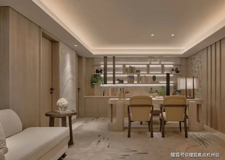 夹层被安置成了书房,安静、雅致,为了显露对生活的慰藉,像是把精神世界现实化的地方,展现修养、审美甚至家风。也如三毛在《送你一匹马》中所说:“许多时候,自己可能以为许多看过的书籍都成过眼烟云,不复记忆,其实他们仍是潜在的。”