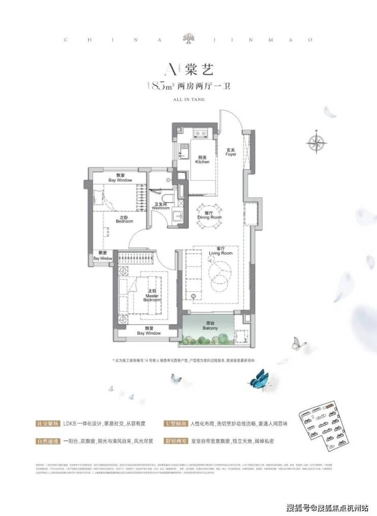 建面约105㎡3房2厅2卫,做到了三开间朝南+4个飘窗+双面阳台系统+主卧套房设计+270°转角飘窗,该户型的居住体验、舒适度、尺度感,是同级别产品所无法比拟的。