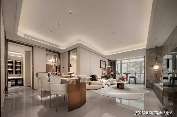项目首层通过 硬朗直线呼应柔和曲线勾勒,辅以温润石材与古铜色金属线条 融合,打造东西方美学共融的艺术藏品