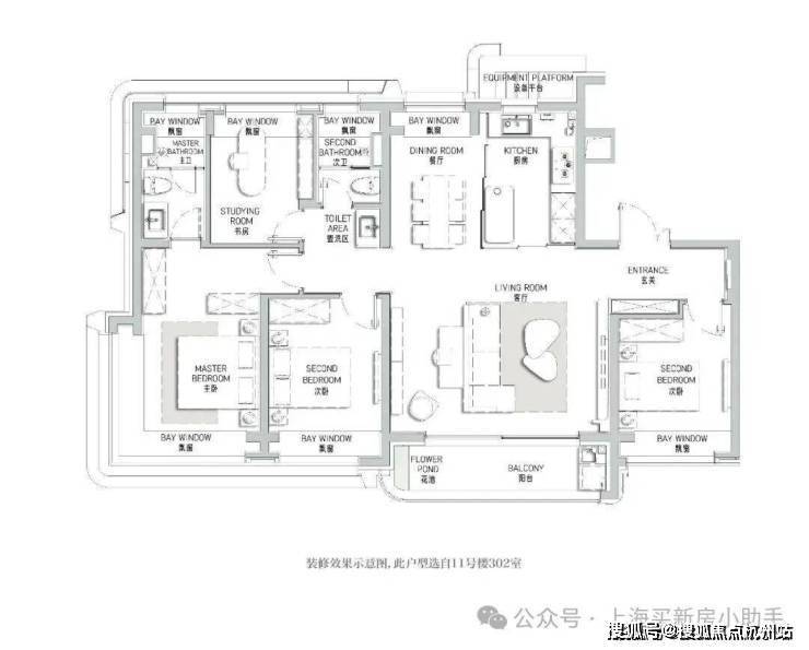 建面约120㎡的户型 ,定制LDKB一体化宽厅,更舒适的功能定制, 270°转角窗观景套房 设计,实现了居住品质与观景的完美结合。