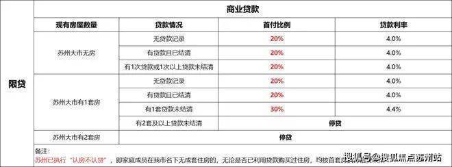 简单来说就是,苏州没房首付最低20%;有1套房贷款没结清,首付最低为30%,有2套停贷。