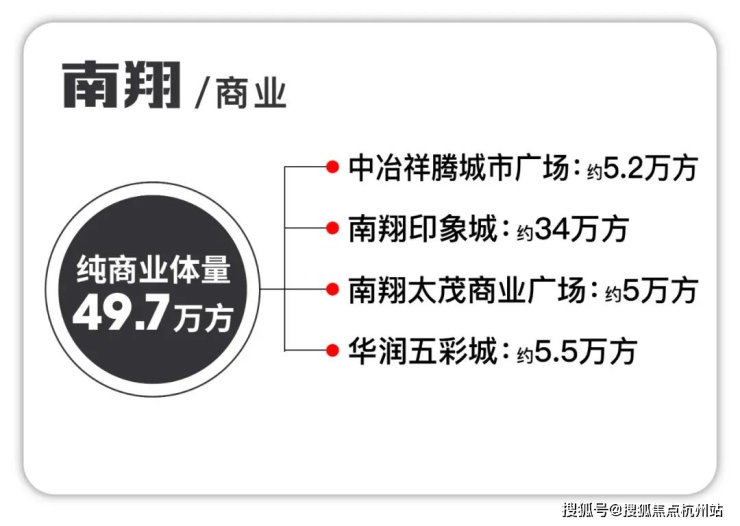 南翔云集了中冶祥腾广场、太茂、家乐福、印象城Mega、五彩城等商业体。纯商业体量高达约50万方,市区绝大多数板块都没有如此密集的商配。