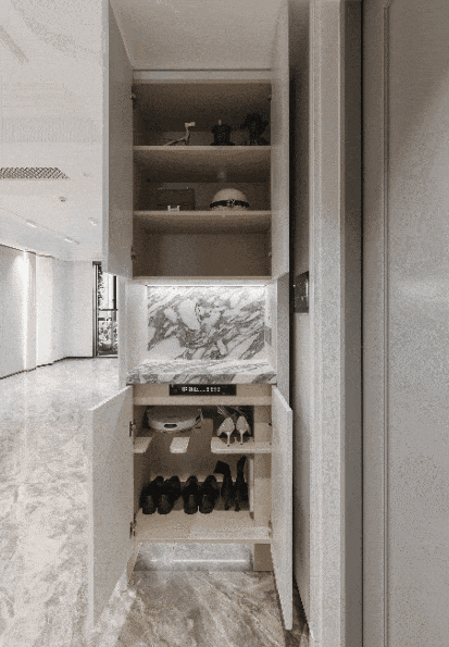 超强的系统收纳:一进门就做了双面收纳,鞋柜、储物柜、开放格,还考虑到了扫地机器人的空间,细节满满。