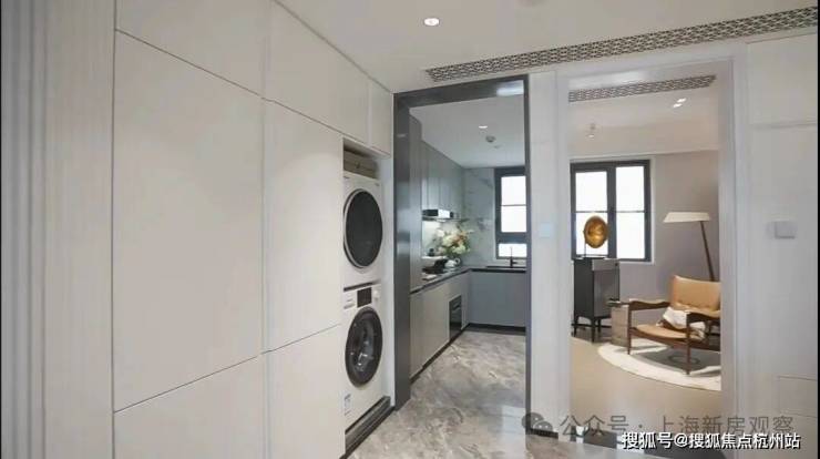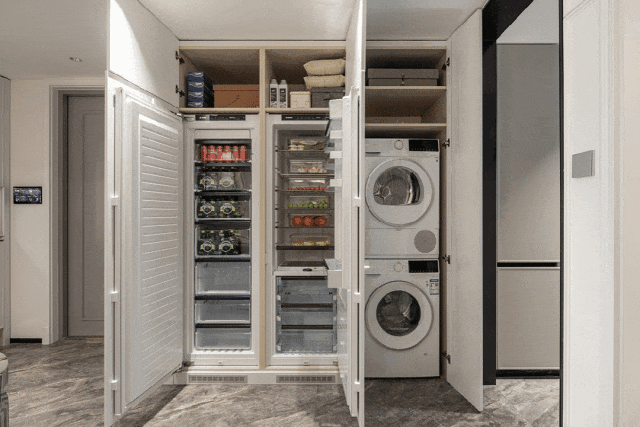 还有一整面墙的收纳,两台博世嵌入式大冰箱,一台博世洗衣机,一台博世烘干机,上面一整排还打造了储藏空间。