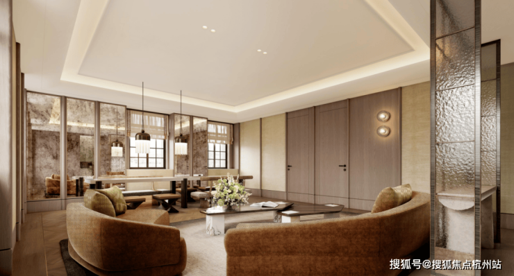 外立面时尚大气,设计灵感源自武康大楼的曲面弧形,采用大面积玻璃幕墙+古铜棕铝板、红砖、原石与金属边框交织,呈现经典的曲面转角、Art-Deco法式装饰阳台以及经典的三段式黄金比例运用。