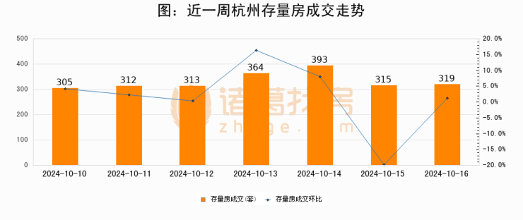 从存量房来看,2024年10月16日杭州存量房单日成交319套,比昨日增加4套,环比上涨1.3%。从近一周存量房成交来看,杭州存量房日均成交套数为331套,10月16日单日成交319套,低于近一周平均水平3.6%。