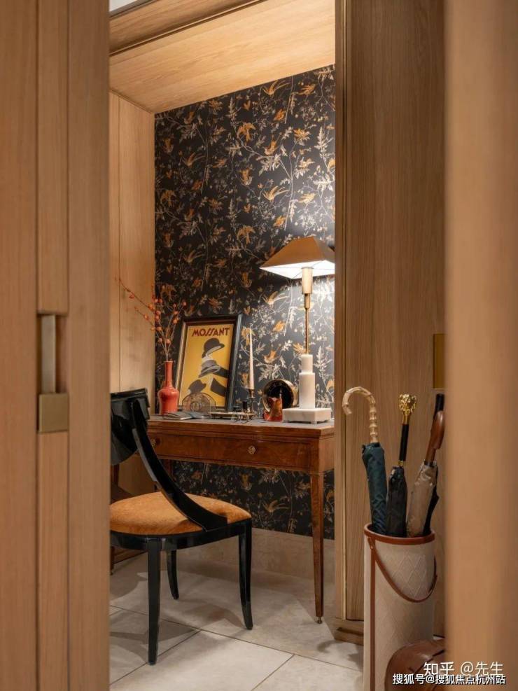 玄关具有变化性与功能多重性,壁纸融合中西方色彩和纹样,除了更衣功能,更摆放了古董书写桌,以手写文字传递信息,传递慢节奏生活方式,丰富空间的装饰和功能,目光所及视角变得丰富。
