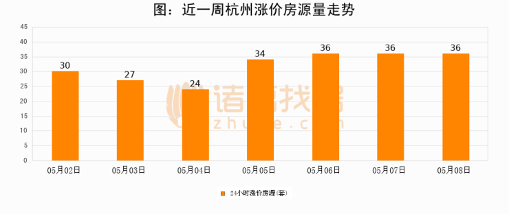 根据诸葛找房数据显示,杭州24小时涨价房源量为36套,较05月07日持平。