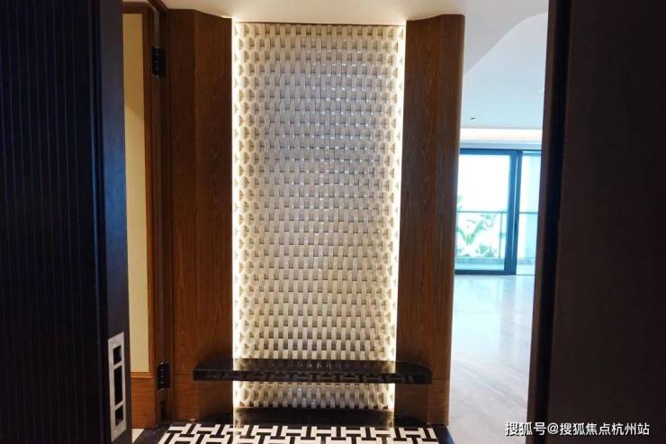 另一个样板间则是170㎡的,这个户型是电梯双开门的类一梯一户。开门以后映入眼帘的是陶瓷的编织纹玄关背景墙。