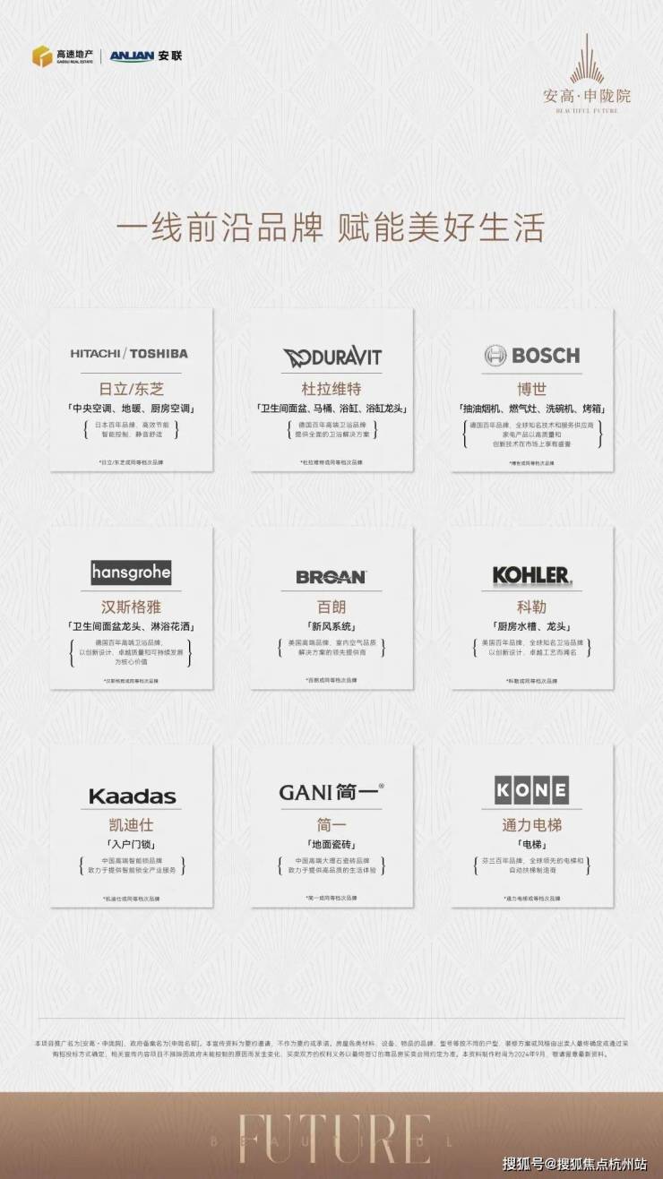精选国际一线品牌:全屋配置简一瓷砖、百朗新风系统(或同等品牌);日立或东芝(或同等品牌)中央空调、地暖以及厨房空调;