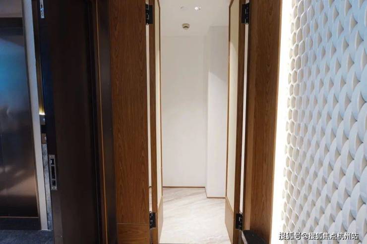 安高这次打造的交付样板间,是从电梯厅开始的。107㎡是一梯两户,电梯间区域,主要以不锈钢条作为通高区域的墙面划分,吊顶带金属弧线。入户门前,金属面板搭配编织纹,从上方打下来的暖色调灯光,映照在项目logo和室号之上,让业主从电梯里出来走到家门的时候就已经给满了仪式感。