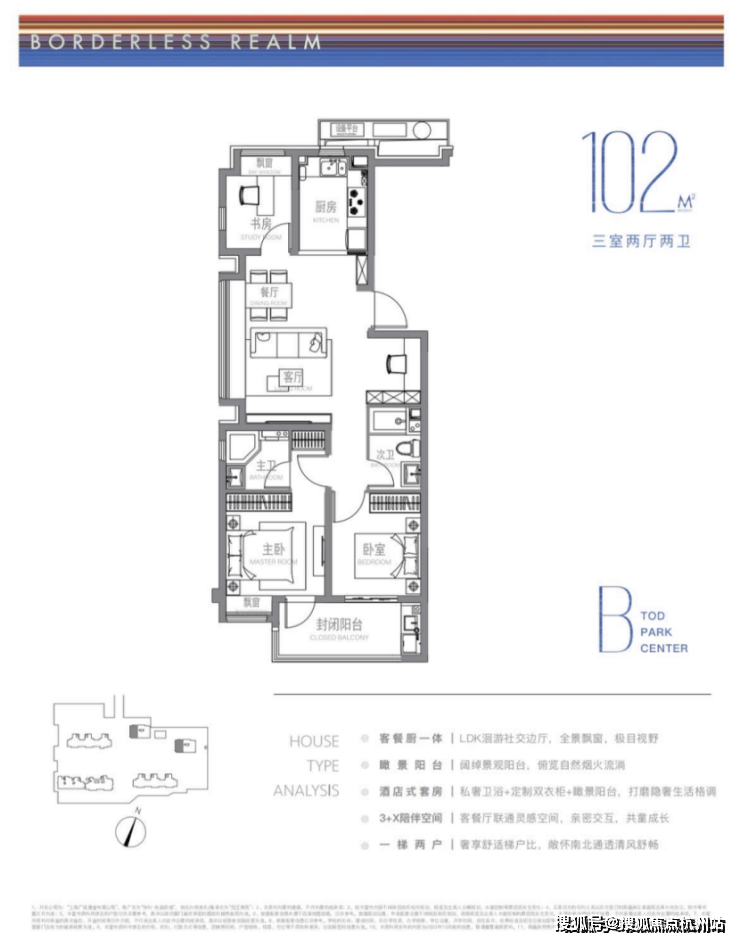 建面约102m²户型特点:LDK洄游式景观边厅,景致拉满,3+X陪伴空间,承载更多自定义功能需求,开放式厨房,烹饪与客餐厅无界互动。