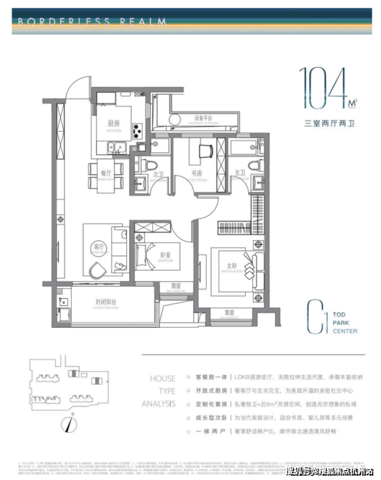 建面约104m²户型特点:LDKB洄游式竖厅+开放式厨房,生活尺度无限拉伸,主卧近6m²灵感空间,承载更多功能可能,成长型的次卧,书房儿童房随心所欲。