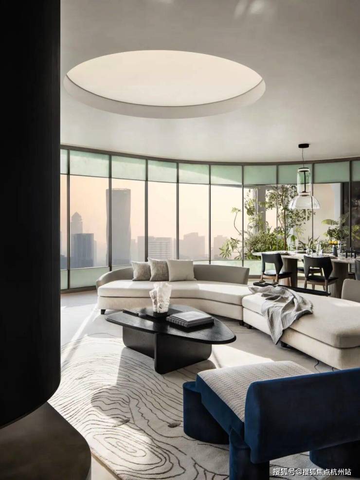•外立面:蓝灰色中空Low-E玻璃 + 浅灰色铝板,光影流转间与江岸同频呼吸•灯光设计:黎欧思照明操刀,与万象城、来福士同源,夜幕中温润如玉•总规模:全案仅5席“天际平墅”组团•户型面积:每户约1064㎡(标准层),层高3.9米!