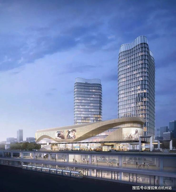 金属平纹屏凸显了塔楼顶部,这个金属屏形成的双曲塔冠,延续了塔楼的整体语言。塔冠的折叠造型使两座塔楼在杭州的天际线上形成独特的剪影。塔楼底部采用锥形造型,使其能够穿过商业裙楼,打造生长挺拔的造型。