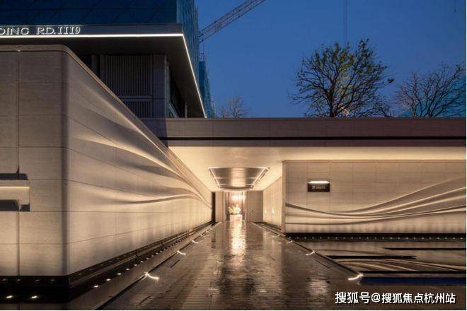 采用米黄色温润石材,巧妙模拟风的流畅形态,营造出既庄重又舒适的归家氛围。这片宽广的流线型石墙在柔和灯光的映衬下,更显璀璨夺目,而风雨连廊的灯带设计,更添一份尊贵仪式感。
