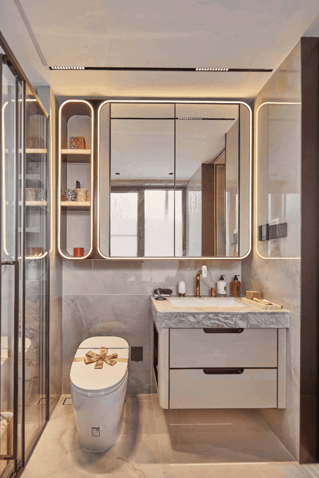 尺度的越级 :四开间朝南,客厅大面宽,相当于 “把别人家的客厅搬进了自己家”。独立玄关形成 “入户缓冲区”,避免开门见厅的尴尬;双套房设计,主卧套间配备独立卫浴,卫浴空间引入 “双台盆 + 浴缸 + 淋浴” 的三段式设计,堪比五星级酒店套房。