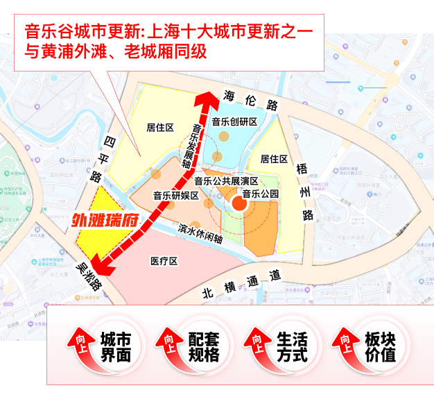 旁边还有上海首批十大城市更新单元——虹口嘉兴01单元。这个单元是内环少有的“完整水系风貌更新区”,未来将依托虹口港打造“一湾两半岛”,定位“东方百老汇”:滨水步行道连贯成片,百年石库门里弄变身爵士乐演出场地与独立艺术画廊,滨水市集的霓虹与水岸光影交织,形成“生活为体,音乐为魂”的海派艺文场景。这种“历史+生态+艺文”的高级烟火气,是传统豪宅区没有的,住这儿不是“看风景”,而是把生活过成“未来艺术化剧场”。