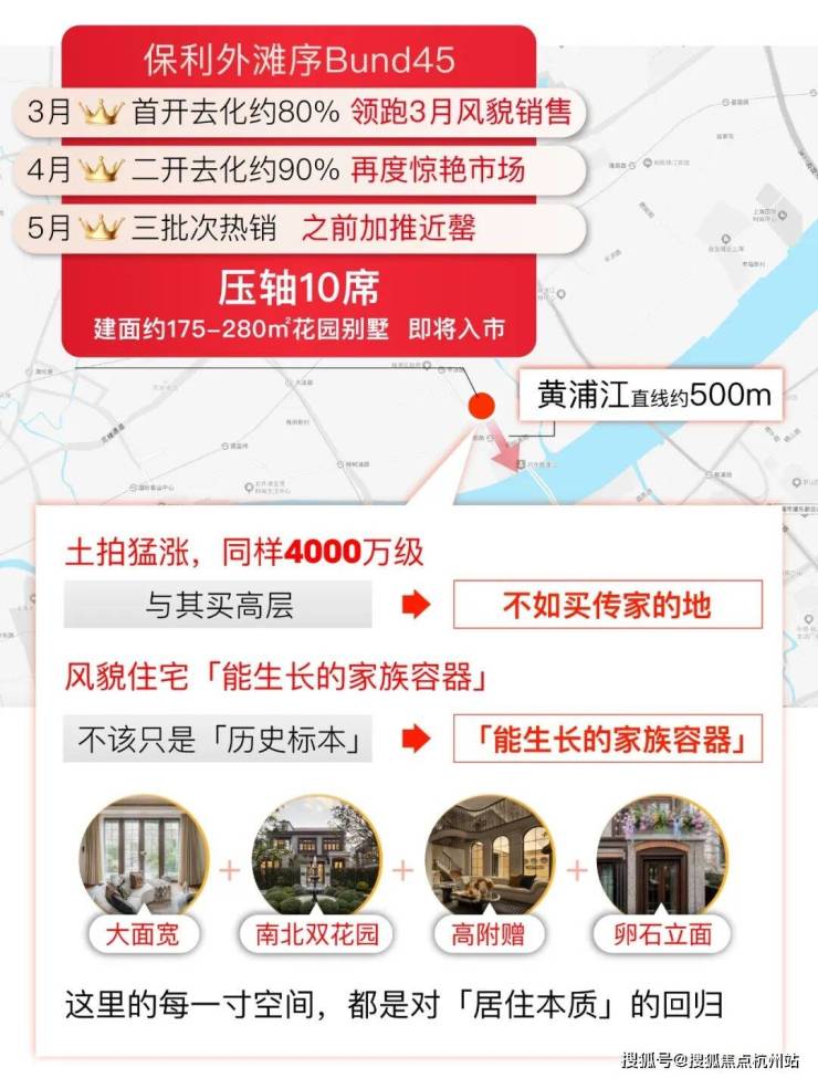 杨浦滨江风貌带全新供应,约500米滨江+臻稀风貌+超级花园,保利·外滩序BUND45在首开去化约80%,领跑3月全上海风貌销售榜后,保利·外滩序Bund45风貌于4月再度入市,去化约90%。