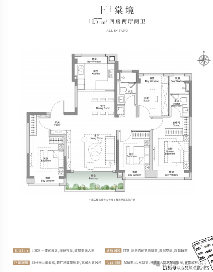 建面约105㎡3房2厅2卫,做到了三开间朝南+4个飘窗+双面阳台系统+主卧套房设计+270°转角飘窗,该户型的居住体验、舒适度、尺度感,是同级别产品所无法比拟的。