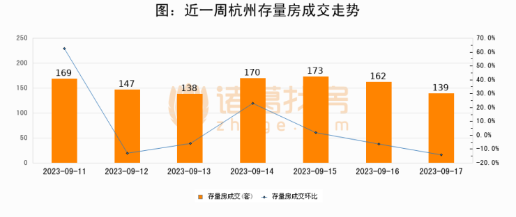 从存量房来看,2023年09月17日杭州存量房单日成交139套,比昨日减少23套,环比下降14.2%。从近一周存量房成交来看,杭州存量房日均成交套数为156套,09月17日单日成交139套,低于近一周平均水平10.9%。