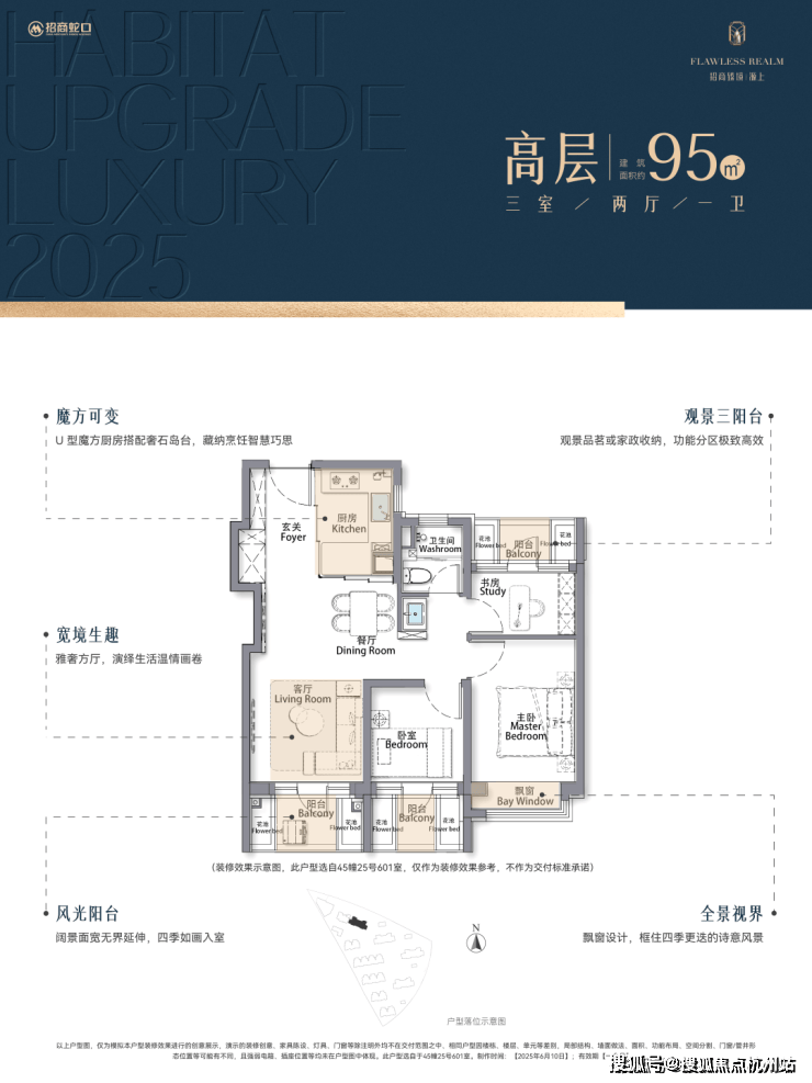 再加上 南向大面宽短进深、全卧飘窗、L型转角阳台设计 ,哪怕小户型95㎡3房,尺度感都超棒,采光和视野更是一流。