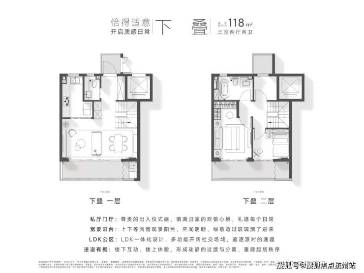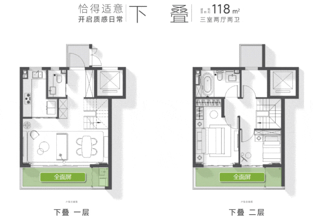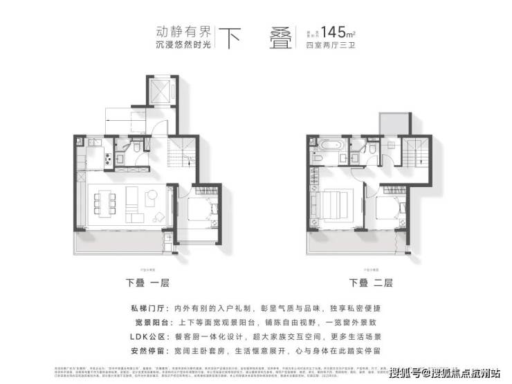 建面约145㎡户型,通过“咬合式户型”的设计,让相邻两个叠墅户型,实现了“上3下1”、和“上4下0”的功能性自由。