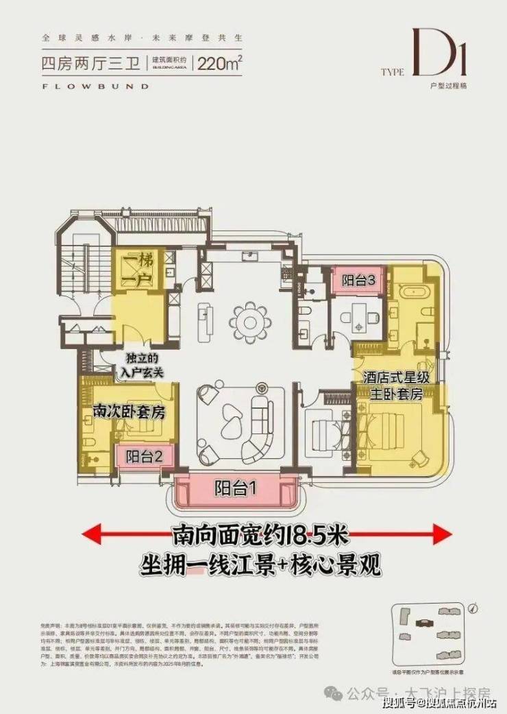 标配一梯一户,真正独立的电梯厅空间,增加了至少5-8个平方的可利用面积;三开间朝南+南向双阳台+大横厅的设计,户型格局方正,通风采光与视野完美;主卧套房设计,步入式衣帽空间+干湿分离主卫,尺度奢阔。