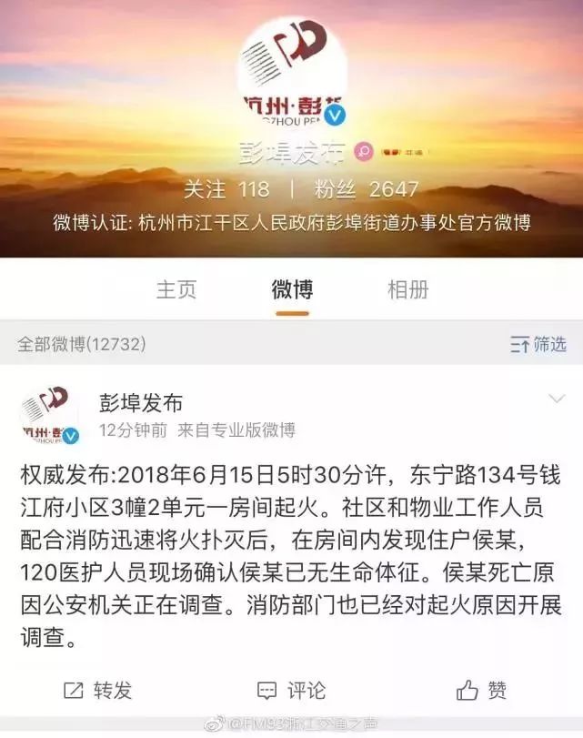 据江干区彭埠发布消息称:2018年6月15日5时30分许,东宁路134号钱江府小区3幢2单元一房间起火。社区和物业工作人员配合消防迅速将火扑灭后,在房间内发现住户侯某,120医护人员现场确认侯某已无生命体征。