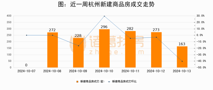 根据杭州市住房保障和房产管理局数据显示,2024年10月13日杭州新建商品房成交163套,较昨日减少110套,环比下降40.3%