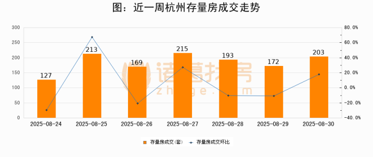 从存量房来看,2025年08月30日杭州存量房单日成交203套,比昨日增加31套,环比上涨18%。从近一周存量房成交来看,杭州存量房日均成交套数为184套,08月30日单日成交203套,高于近一周平均水平10.3%。