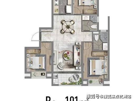 101/107㎡ 3 房 2 厅 2 卫 :宽厅设计、全景阳台、三卧室全飘窗,空间更阔绰。