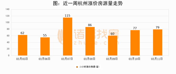 根据诸葛找房数据显示,杭州24小时涨价房源量为79套,较03月10日增加2套,环比上涨2.6%。与此同时,涨价房源占比小幅扩大,业主信心有所提升。