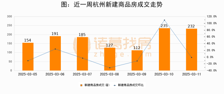 根据杭州市住房保障和房产管理局数据显示,2025年03月11日杭州新建商品房成交232套,较昨日减少3套,环比下降1.3%。近一周杭州新建商品房日均成交177套。03月11日单日成交232套,高于近一周平均水平31.1%。