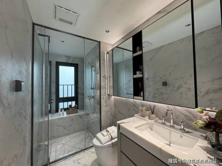 双卫配置,其中一个做了干湿分离,科勒台盆+双智能马桶+高仪花洒,除雾镜柜均内置了牙刷消毒器、预留吹风机插座。主卫镜柜还有美妆冰箱,收纳空间相当充足。