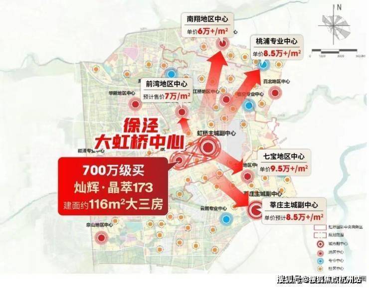 据销售人员透露,灿辉·晶萃173的总价在700-1000万左右,116㎡改善大三房总价700万级。而同样700万,只能买七宝、莘庄、桃浦等板块的90㎡紧凑户型,或者买南翔、华漕的100㎡户型。这些板块比起徐泾如何?
