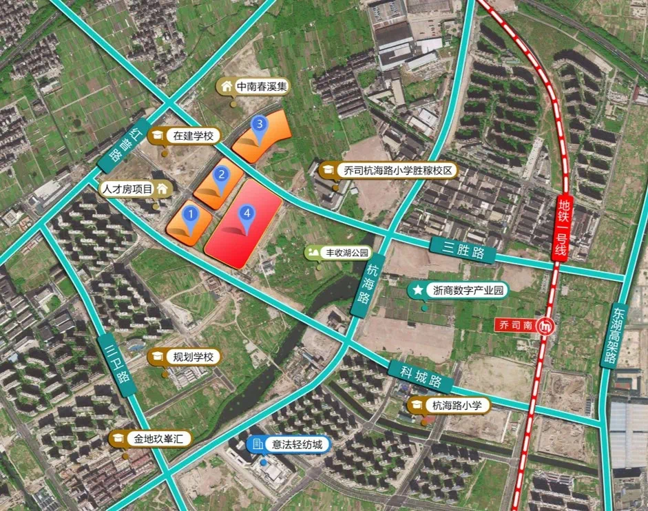 四堡七堡单元JG1402-32地块,直线距离御道站约400米,距离江河汇也才1.3公里,但缺点是临近杭甬高速和铁路;而JG1402-16地块虽然距离地铁稍远,但少了高速和高架的干扰。