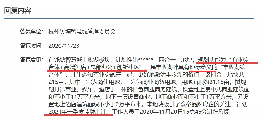 去年,在问政平台上,服务网上钱塘智慧城管委会的答复中就有提到,丰收湖边上的“四合一”地块,规划功能为“商业综合体+高端酒店+总部办公+创新社区”,是具有地标意义的丰收湖综合体。