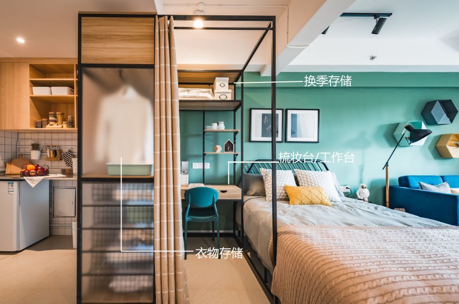 这是领寓菁社青年社区的一个35.00㎡的一居室,用铁架搭出了一个简易的步入式衣帽间,满足衣物收纳、换季收纳之外,还嵌入了一张小书桌,衣柜、梳妆台和工作桌融为一体。