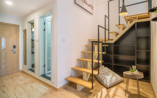 以下这种复式小户型在泊寓的项目中很常见。将承重板固定在墙上,形成架空效果。图中这个户型面积为20平左右,一层全部作为日常活动区,二层单纯作为睡眠区。由于床板设置在入户处的上方,租客进门排名前列时间不会注意到,目光所及之处,就宽敞得多了。