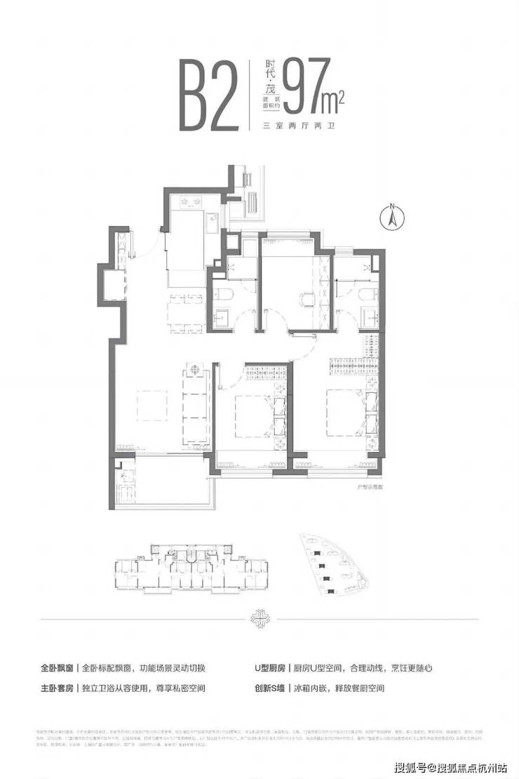 建面约97平的三房两厅两卫,在89户型基础上多了一个卫生间,450-500万级别功能性更强。