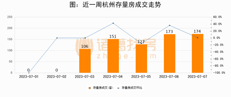 从存量房来看,2023年07月07日杭州存量房单日成交174套,比昨日增加1套,环比上涨0.6%。从近一周存量房成交来看,杭州存量房日均成交套数为104套,07月07日单日成交174套,高于近一周平均水平67.3%。