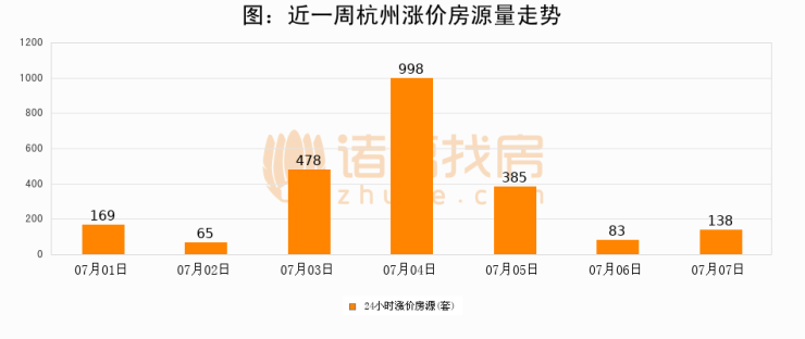 根据诸葛找房数据显示,杭州24小时涨价房源量为138套,较07月06日增加55套,环比上涨66.3%。与此同时,涨价房源占比小幅扩大,业主信心有所提升。