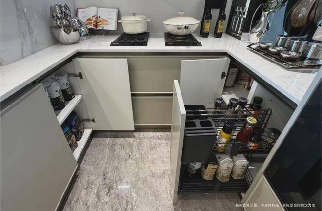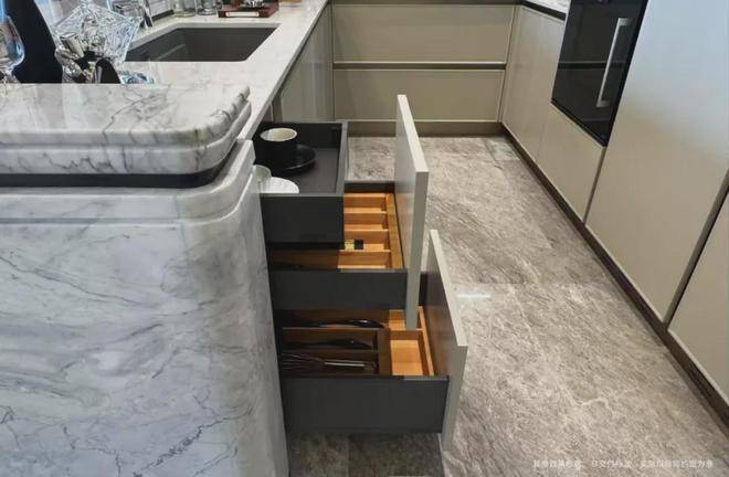 为使厨房成为「真正幸福之地」,璞元在各个细微之处倾注关怀,从地柜拉篮系统,到上柜系统,再到抽屉分格系统,浅抽与深抽搭配,让整个厨房空间,既百变,又充满秩序。
