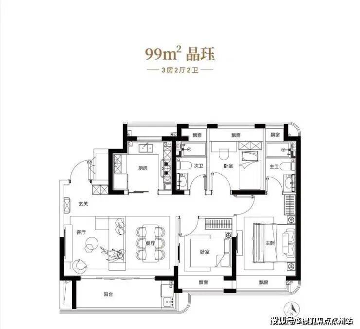 约99平3房户型,宽厅设计,空间感十足,搭配超大阳台,景观视角绝佳,U型厨房,全屋飘窗。